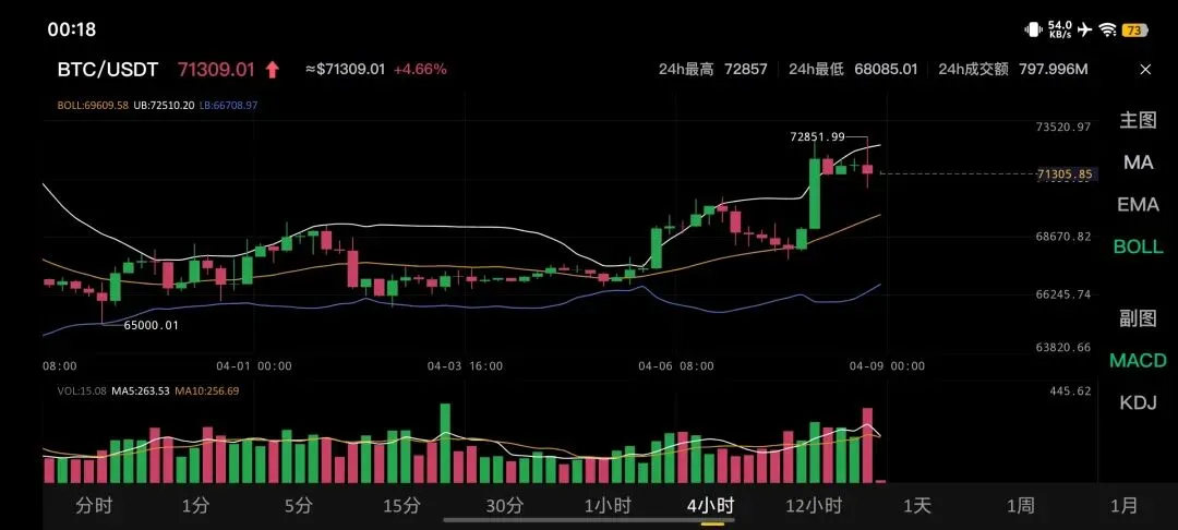 · 当前价格:约71,300美元,处于布林带上轨(72,500美元)下方,中期多头趋势完好,但短线明显超买。