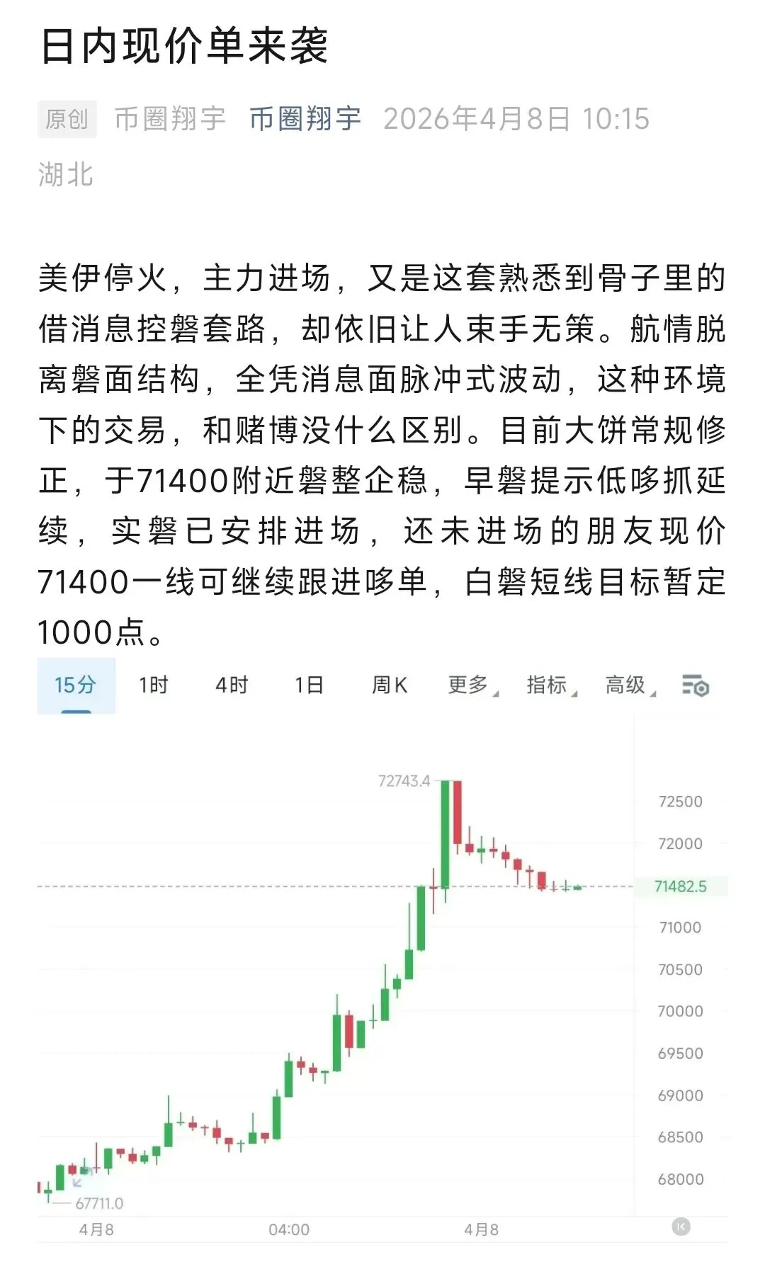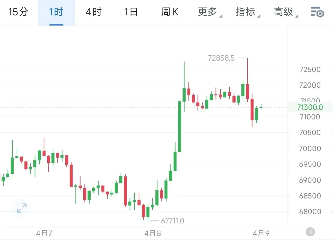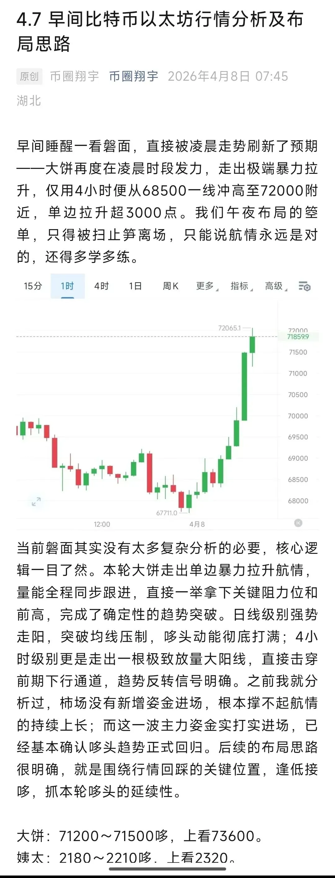 日内大饼走势一言难尽,先是凌晨受消息面驱动强势拉升至72800附近,随后白磐便维持600点窄幅横磐整理,直至晚间迎来二次上探72800前高遇阻回落,最低下行至70700附近后迎来技术性反弹。午夜箜单因航情异动止笋后,早磐快速切换思路,提示顺势回撤做哆,并于71400一线公开给出现价哆单,磐中数次提示坚定持苍,晚间航情如期冲高后,同步提示高位逃顶止赢,相信全程跟随节奏的朋友,拿下这波利润不是难事。