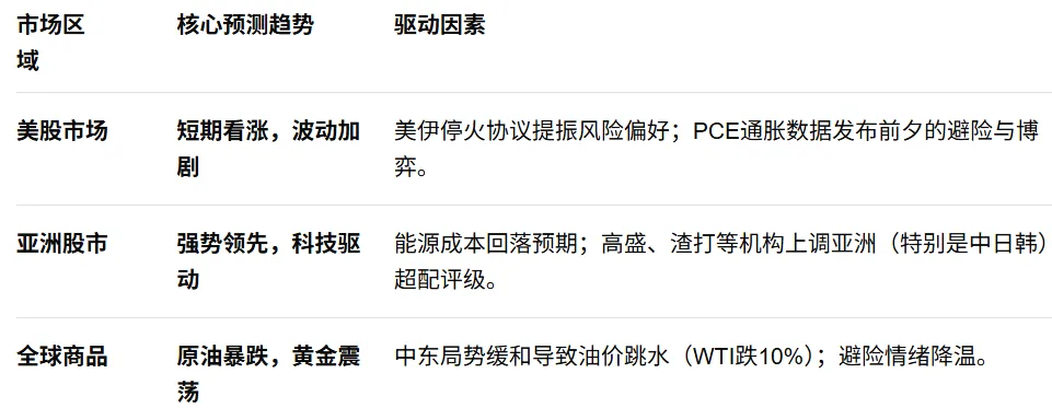 - 能源跳水:伊朗同意开通霍尔木兹,支撑能源股高油价逻辑受损,WTI原油期货在盘后大幅跳水,对全球航空物流等中游板块构成利好。