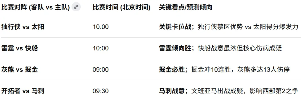 📊 4月9日NBA重点比赛前瞻表