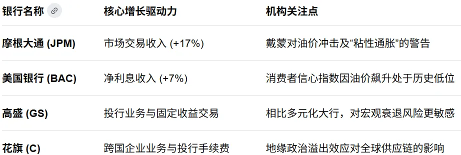 - 交易业务爆发:伊朗局势致金融市场波剧,交易员捕捉价格波动赚取巨额利润。摩根大通 (JPM) 预计第一季市场收入增长17%,花旗集团预计其投行及市场业务收入将录得中双位数(mid-teens)增长。