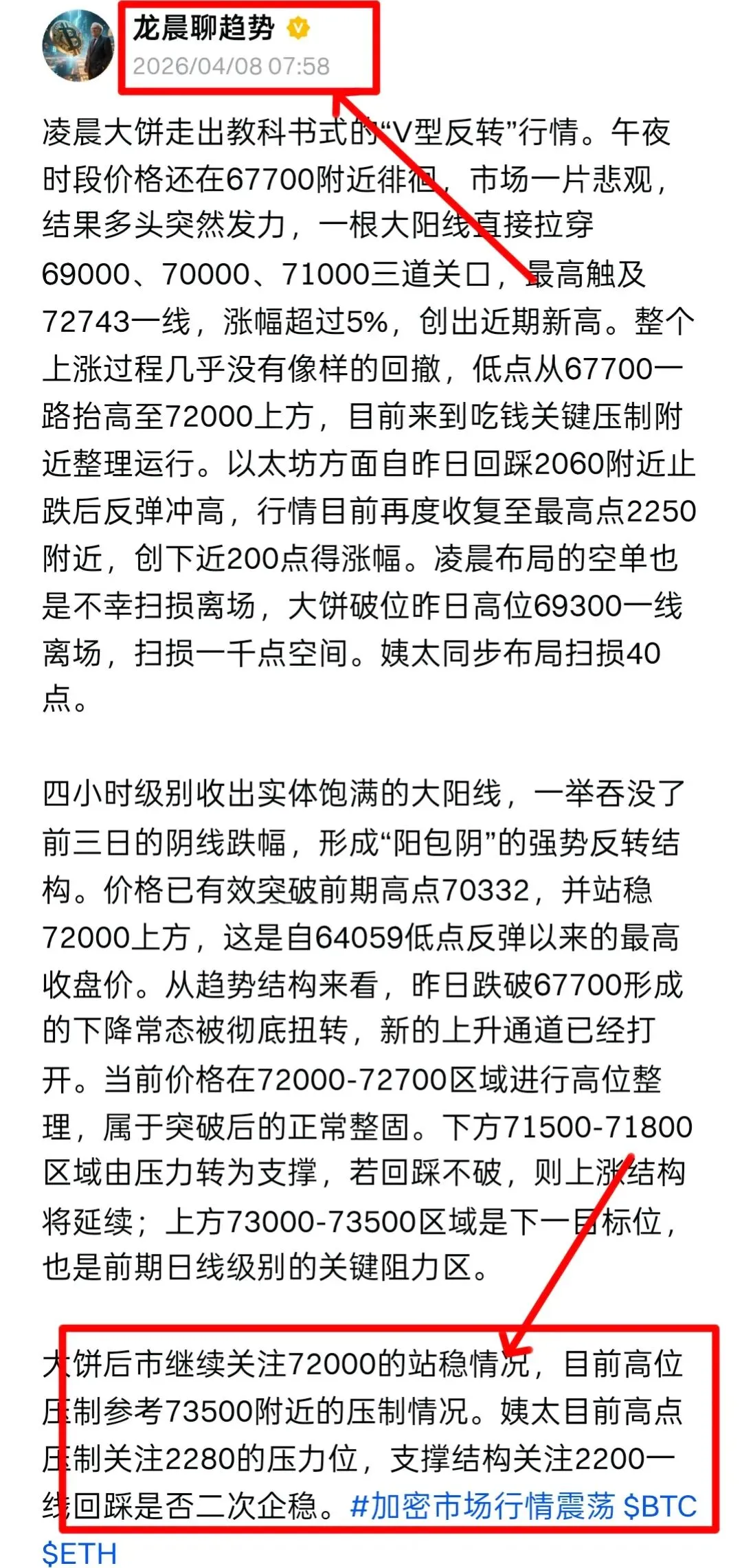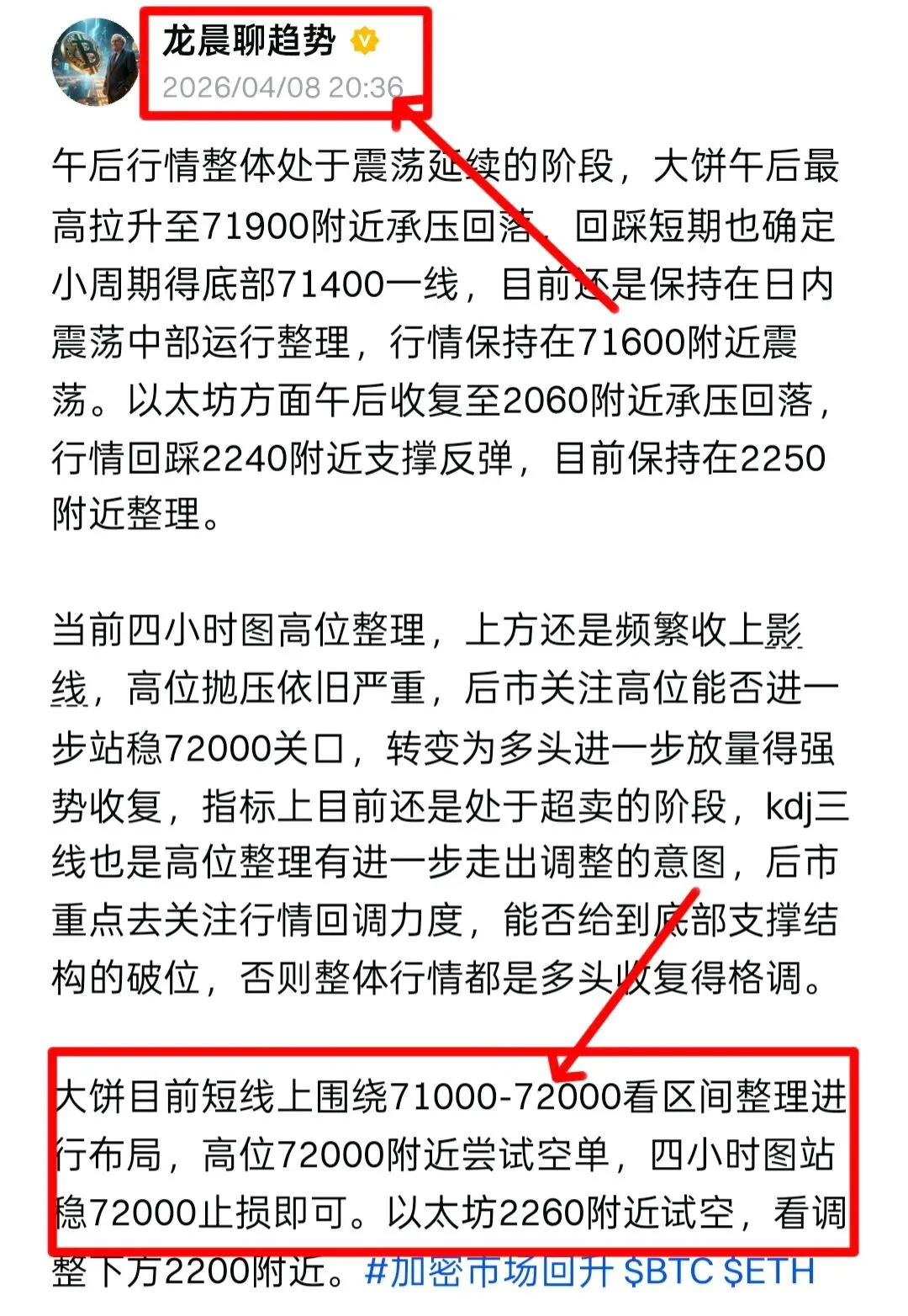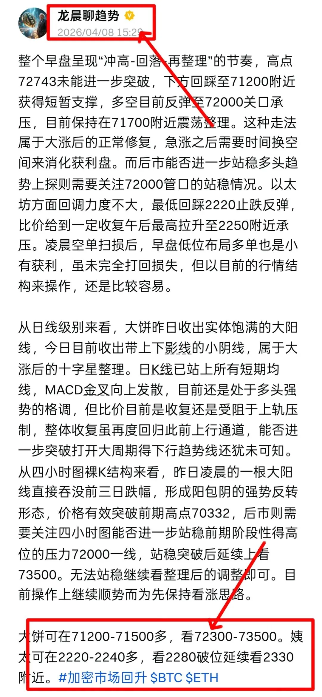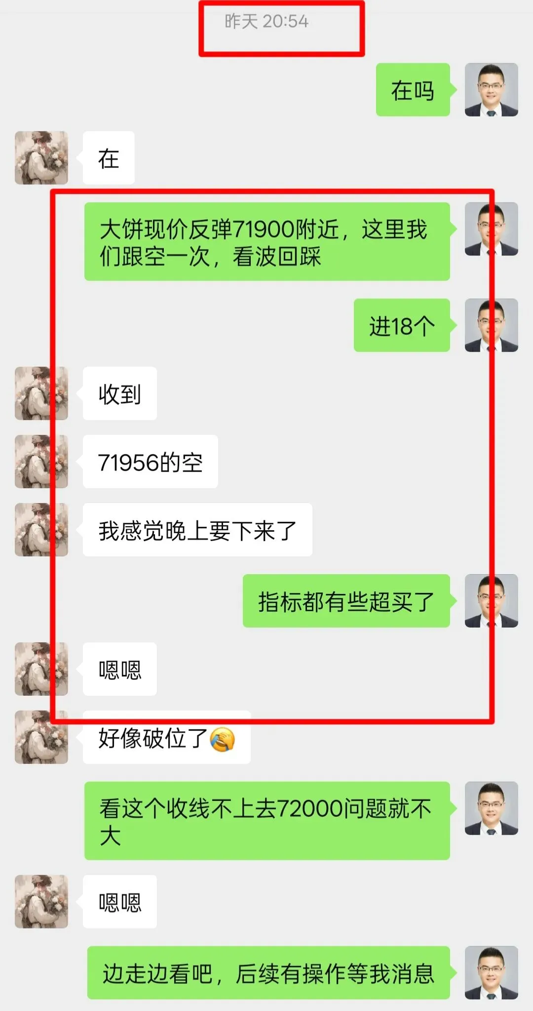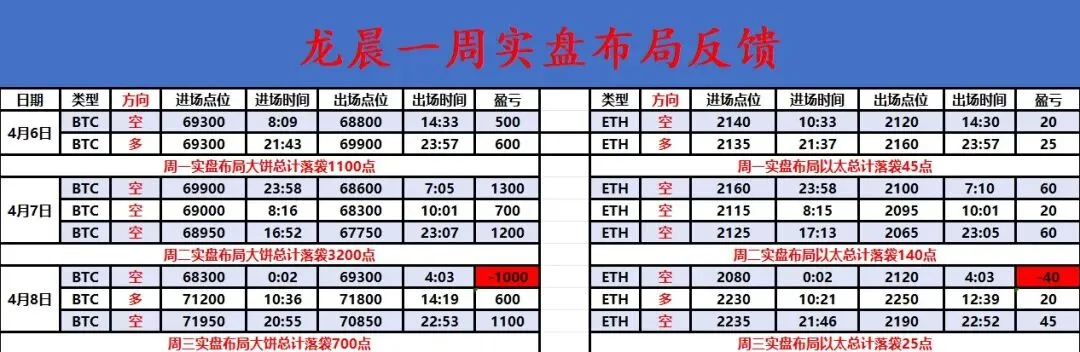 回顾日内行情,大屏早盘受到数据影响,币价整体至70000附近,直线拉高至72800,承压回落,午后回踩需要200附近止跌后日内持续围绕区间震荡,并未走出多空明了的趋势,晚间空头迎来小幅放量走高,行情二次上探72800附近回落,软间行情1度回踩至70800附近止跌,币价再度收复至71400附近震荡整理。以太坊方面二次反弹2070附近受阻承压回落,晚间一度跌破2200大关,目前收复至2215附近整理。日内我们凌晨布局空单扫损一千点空间,日内多空均有所涉猎,也成功挽回损失,日内大饼收获700点空间,姨太收获25点空间。