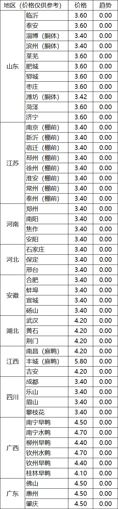 泰安地区肉毛鸡棚前收购价3.50-3.60元/斤,与8日相比持平;