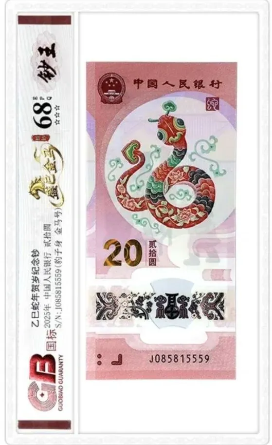 《蛇钞盛巳金马》:全称“2025年20元蛇年纪念钞盛巳金马”,号码由01689+5(金马号)构成,基于其数字组合特征及与乙巳蛇年的对应关系,命名为“盛巳金马”总库存5301,挂牌价188.88元,总市值为100.1万元。