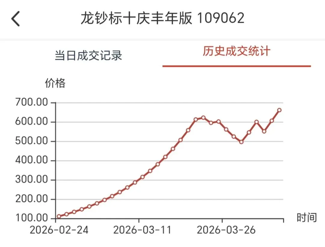 《龙钞标十庆丰年版》:继续走强,大涨9.7%,整体上涨趋势非常强,今天缩量大涨,后期大概率会走加速上涨行情。