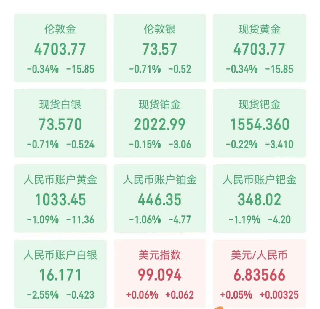 隔夜现货黄金上演“过山车”行情:盘中一度冲高至4857.55美元/盎司,随后因多头集中获利了结大幅回落,最终仅收涨0.29%,报4719.35美元/盎司。今日早盘,这股抛压持续发酵,成为金银回调的核心原因。美伊达成两周停火协议彻底落地,中东地缘政治风险溢价快速消退,市场避险情绪大幅降温,黄金作为传统避险资产的买盘动力显著减弱,进一步放大了回调幅度。
