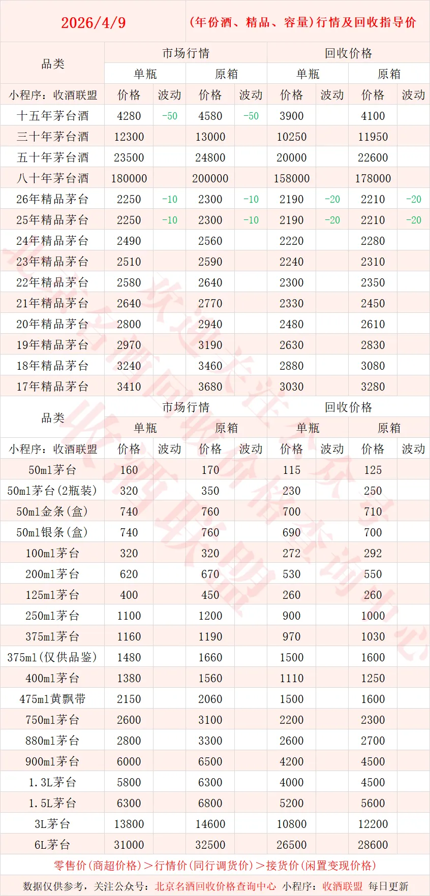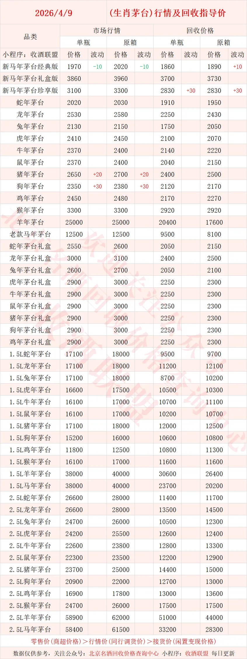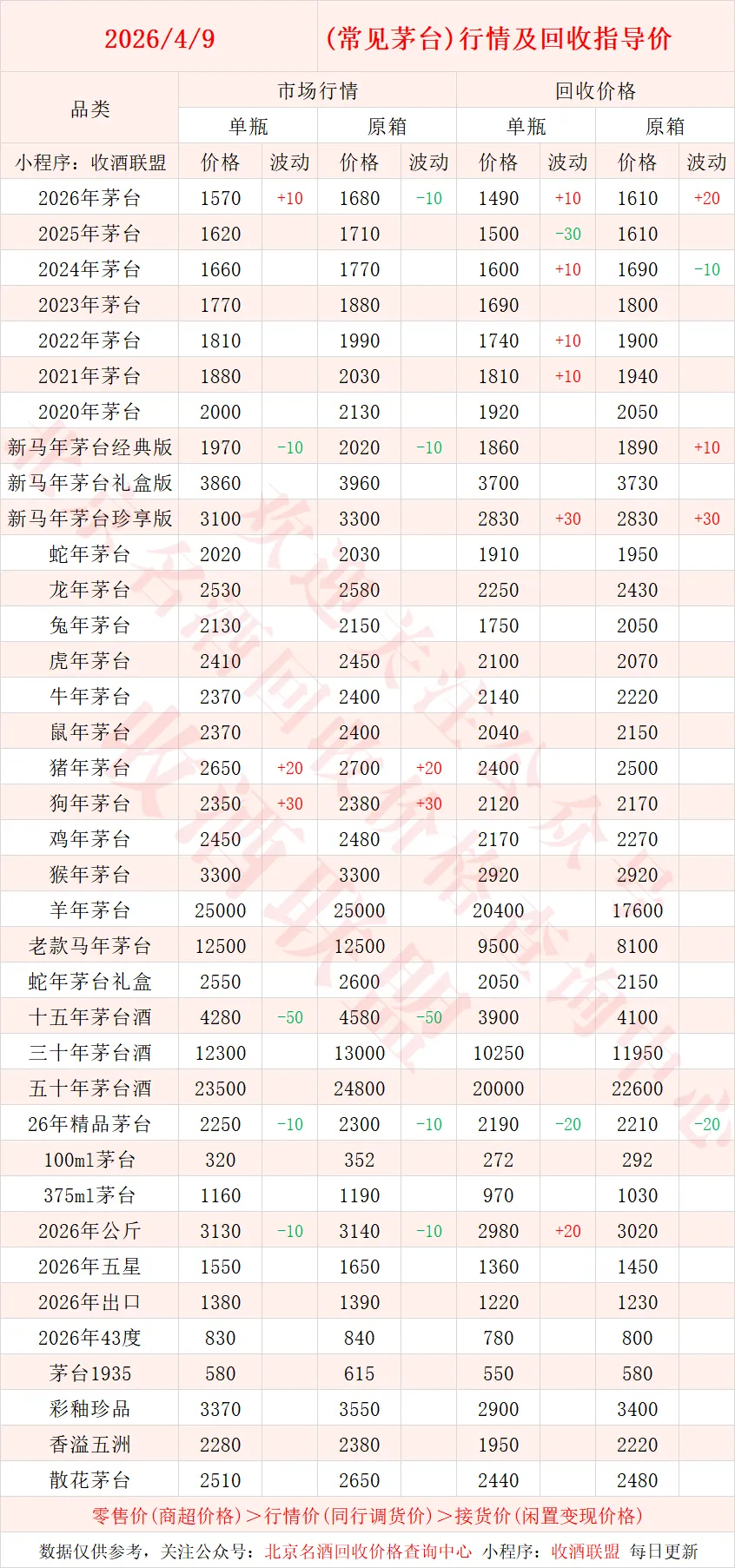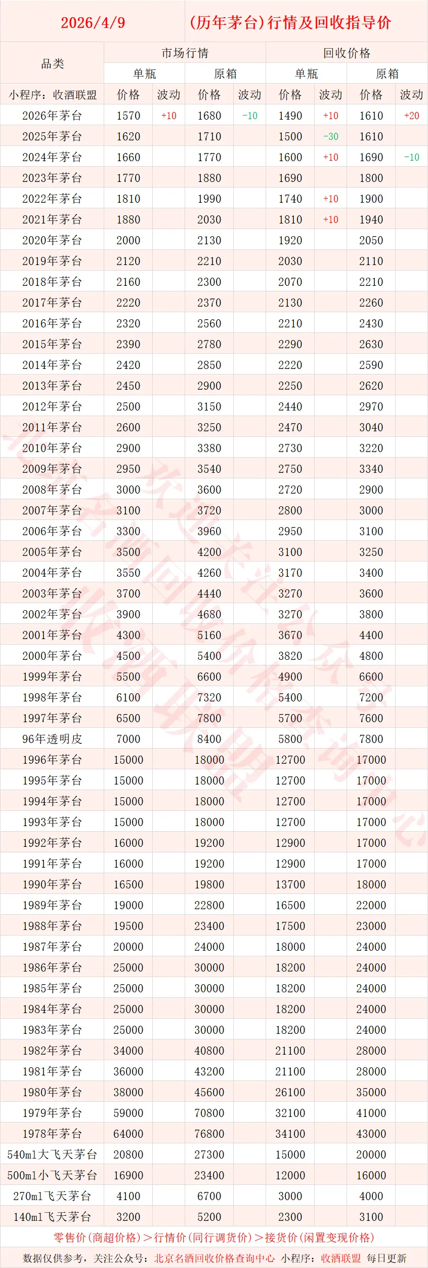 以下内容为,本公众号每日会及时更新的飞天茅台、生肖茅台、年份茅台,陈年茅台及不同毫升容量茅台的市场行情和回收报价;还包含五粮液、汾酒、剑南春、泸州老窖等国产名酒的行情及回收价,法国拉菲、木桐、玛歌等名庄红酒的回收报价,轩尼诗、马爹利、人头马等世界知名洋酒威士忌的回收参考价,每日整理不易,请点击关注支持。▪畅销类茅台行情及接货参考价▪