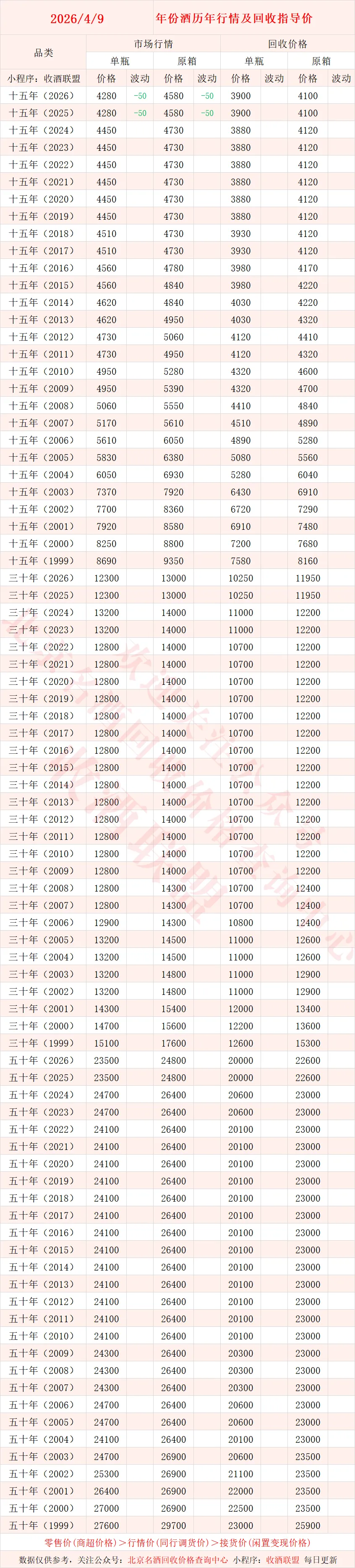 一般低于行情价,是面对消费者闲置名酒回收的价格,受外观品相、包装配件齐全、酒液位置、酒品二次销售难易程度的影响。