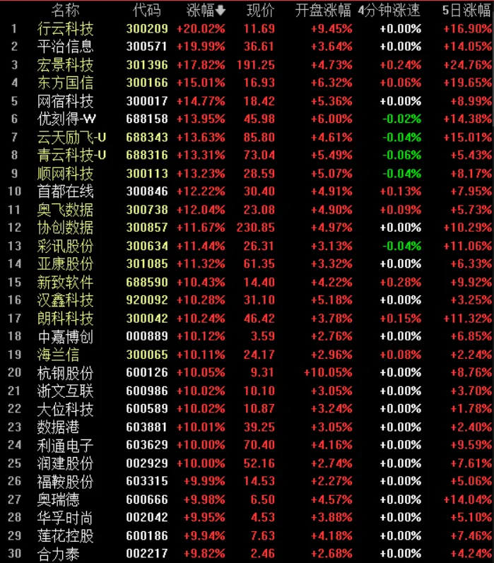 从板块来看,AI产业链集体爆发,其中算力租赁概念走强,大位科技、奥瑞德、
