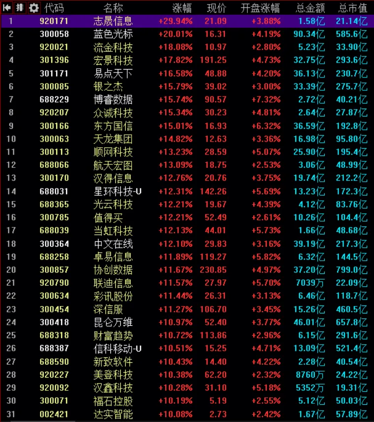 20cm涨停,志晟信息30cm涨停。贵金属概念集体走高,湖南黄金、四川黄金、西部黄金涨停。