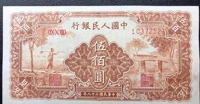 这张老票子叫**“农民与小桥”**,一听名字都能想出画面,发行在1949年,票面上一个农民挑着扁担,老屋斜在一旁,画得细细的,一老一小的树,也跟着伸腰,纸是老棉纸那种,角稍微一卷,就是年头的味道,边框红中透旧,一拿出来能感觉指尖都乡气扑鼻。