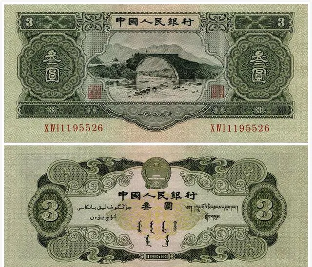这张看着有点眼生,三元面值,不是五也不是十,偏偏是“三”这个数,谁家记账还会用三的,票面上桥和羊,淡淡的绿中带点灰,藏在家里很容易被当废纸夹出去,妈妈说小时候三块钱买半推车煤球都能拉家里一堆,现在这“1953版的三元纸币”,别看当年不稀罕,现在差不多一万上下,真正有点品相的,碰上一手没几家,收藏圈人还拿这当个门槛。