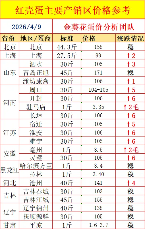 2 0 2 6年 4月 9日全国鸡蛋主流价格