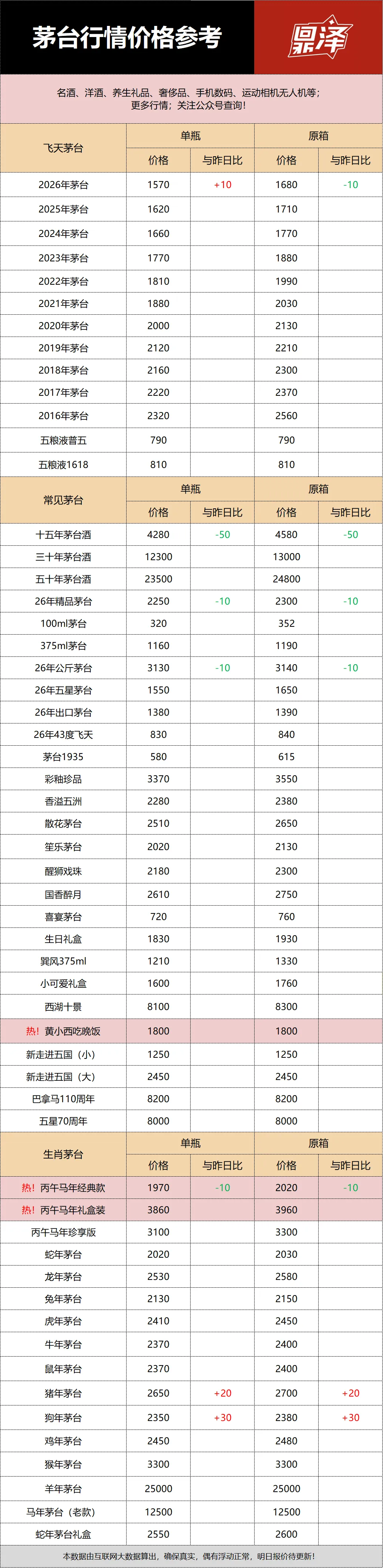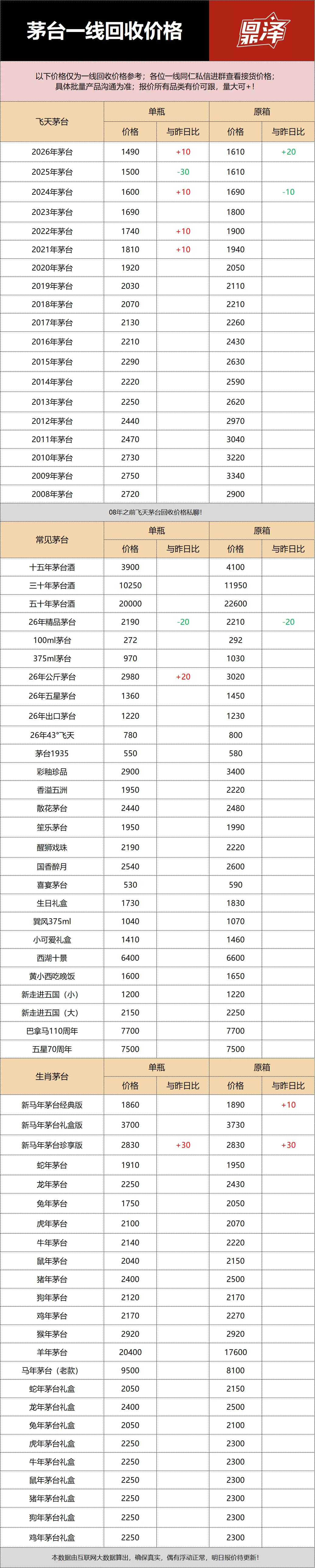 行情价:本公众号发布的价格是行情价格,是全国酒商调该品类茅台的价格,是零售价和回收价的基准价格。