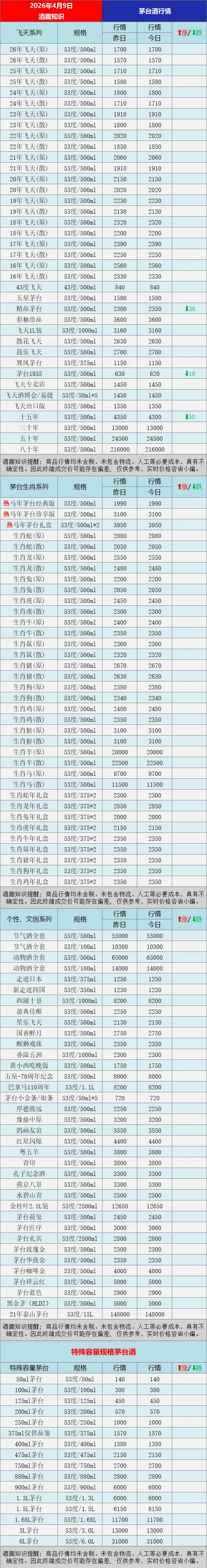 今日茅台酒行情价格参考:精品茅台、茅台十五年、茅台1935等下跌。更多茅台系列酒具体行情参考下文图表:《酒趣知识》温馨提醒:商品信息均未含税、未包含物流、人工等必要成本,具有不确定性。因此终端成交价可能存在偏差, 仅供参考,实时价格咨询小编。注意:茅台等品牌老酒价格小幅波动频繁,老酒受品相克重影响价格差异大,同时不同地区价格有几十元不等的差价,最终以实际成交价格为准!《酒趣知识》多媒体平台同步给您带来茅台酒及时行情参考,同步深挖茅台、五粮液、汾酒等各大名酒资讯,为酒友奉上客观的价格参考与专业的行业解读,让大家用酒有价可依、避坑无忧。丨声明:部分图文来源于网络,版权归原作者所有,如涉及版权等问题,请及时与小编联系删除或修改。