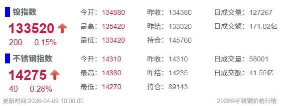 最近两天不锈钢期货盘面先强后弱,震荡反复。4月8日主力合约2605受美伊停火消息带动早盘冲高,一度上探至14325元/吨,午后稍有回落,最终以14310元/吨收盘,涨幅0.67%,主力合约成交10.16万手,但持仓量减了703手至8.85万手。不过9日早盘涨势并未延续,行情走弱,市场情绪又趋于谨慎。