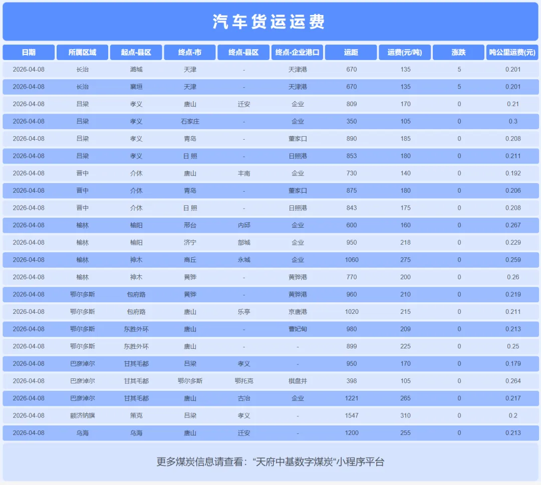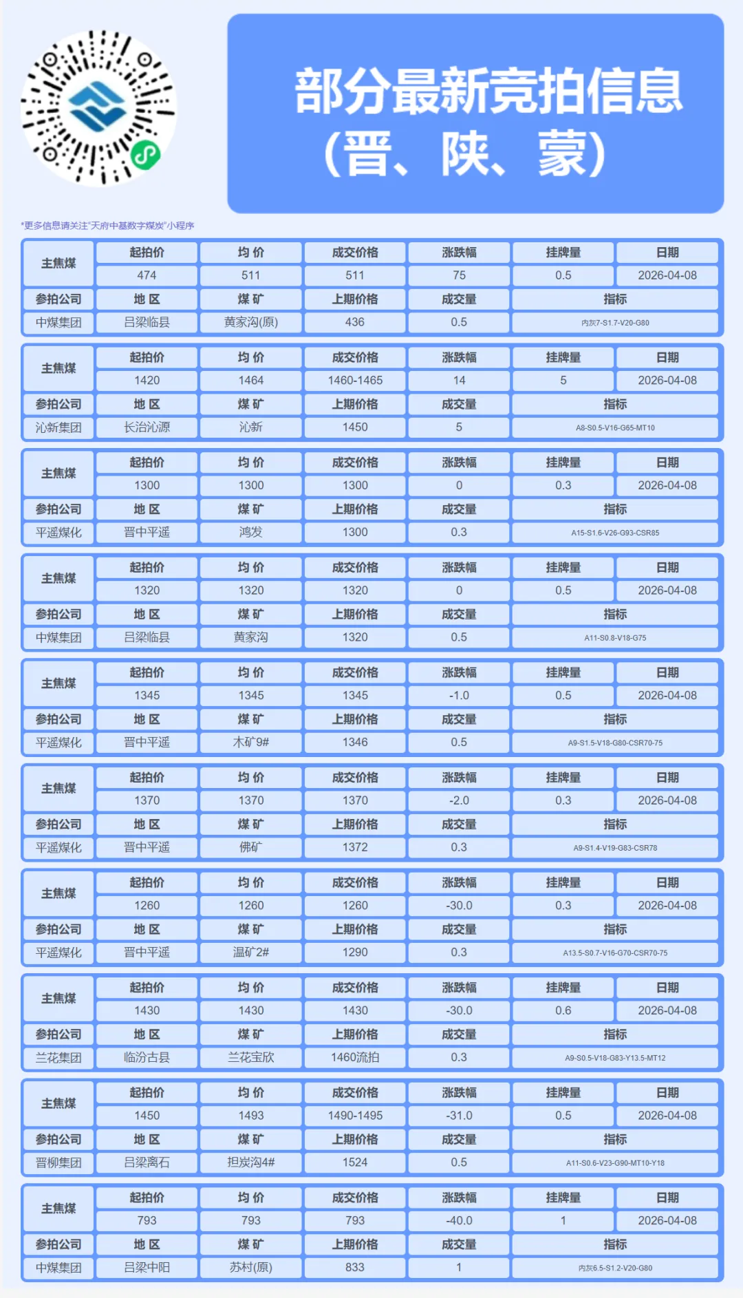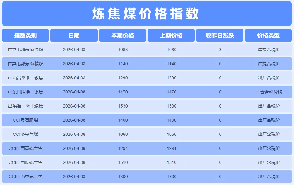 2026年4月8日,焦煤焦炭现货市场整体呈现 “国产企稳、进口试探性反弹” 的微妙格局。山西主焦煤、灵石肥煤及济宁气煤价格全线持稳,焦炭价格在首轮提涨落地后亦保持平稳。值得注意的是,持续承压的进口蒙煤市场出现细微变化:甘其毛都蒙5#原煤价格小幅反弹3元/吨,报1063元/吨,而蒙3#精煤价格则止跌企稳。这一变化虽幅度有限,但或暗示市场在深度回调后,多空力量进入新的平衡试探阶段。