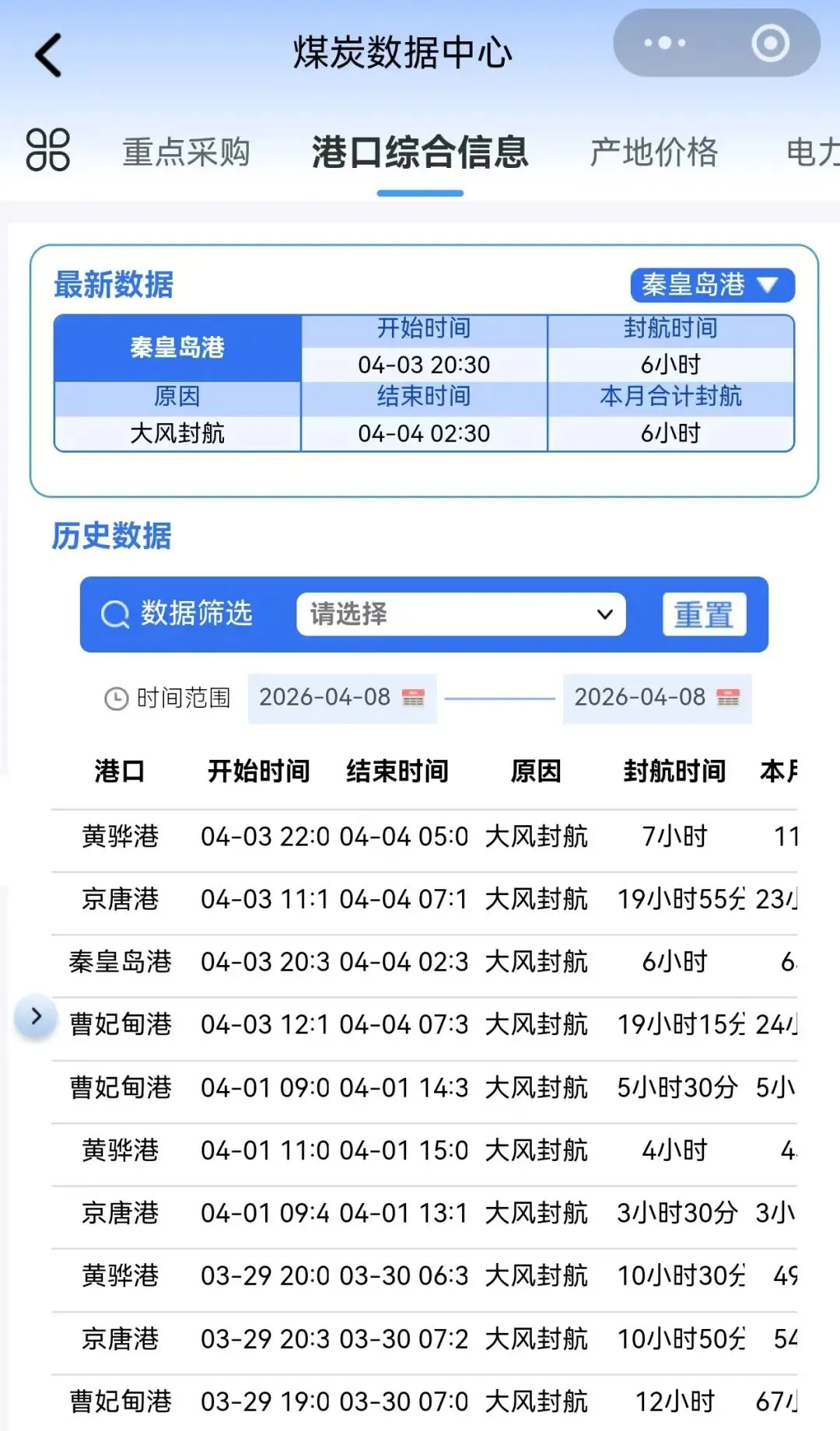 2026年4月3日秦皇岛港因大风封航,本次封航时间为6小时,本月累计封航时间为6小时;4月3日曹妃甸港因大风封航,本次封航时间为19小时15分钟,本月累计封航时间为24小时45分钟;4月3日黄骅港因大风封航,本次封航时间为7小时,本月累计封航时间为11小时;4月1日京唐港因大风封航,本次封航时间为19小时55分钟,本月累计封航时间为23小时25分钟;