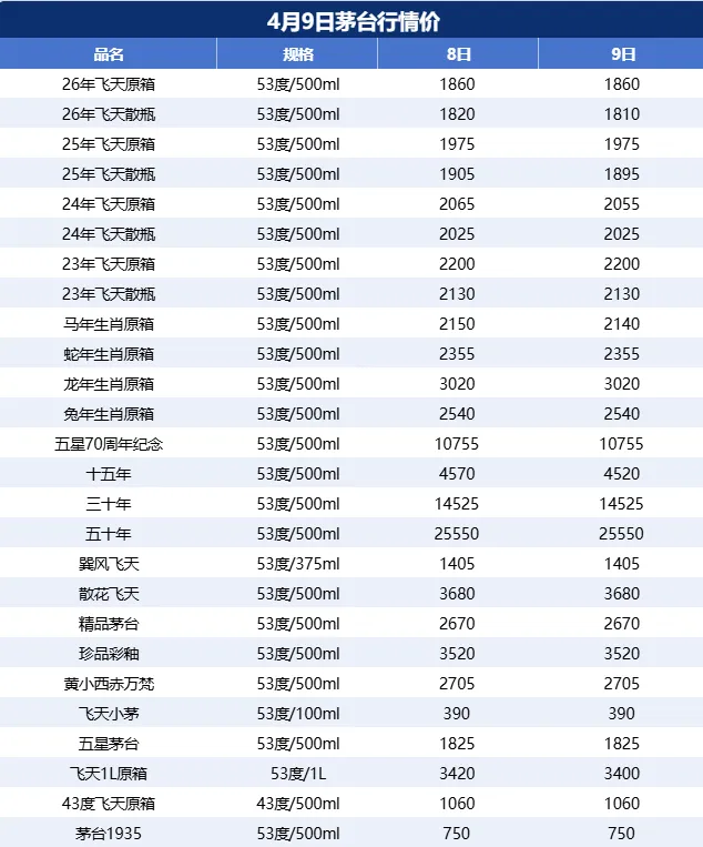 飞天下跌!4月9日茅台酒行情价!