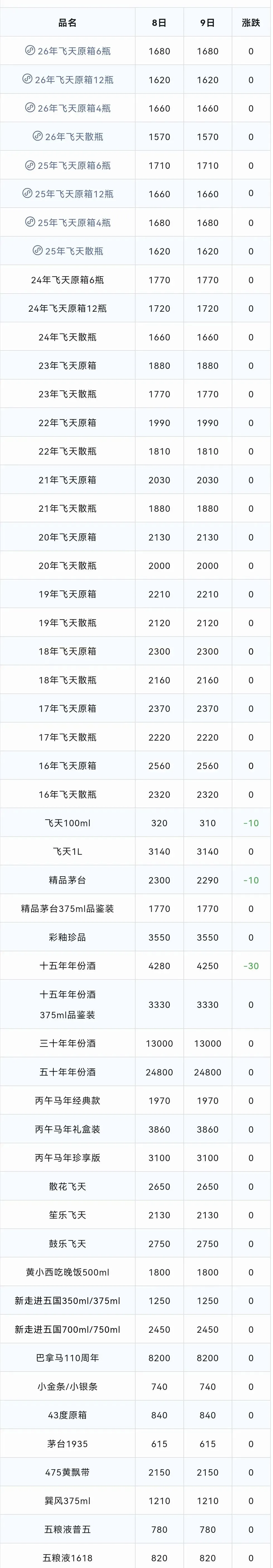 常规茅台中:100ml飞天、精品茅台、十五年年份酒下跌;