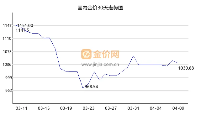 今日国内金价下跌,现价1039.88 元/克,下跌-1.57%,今日开盘价1056.00,最高价1057.11,最低价1035.62。