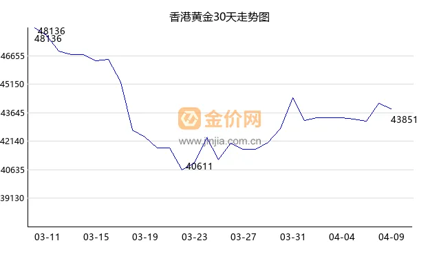 今日香港黄金上涨,现价43851 港币/两,今日开盘价43820,最高价43957,最低价43617。