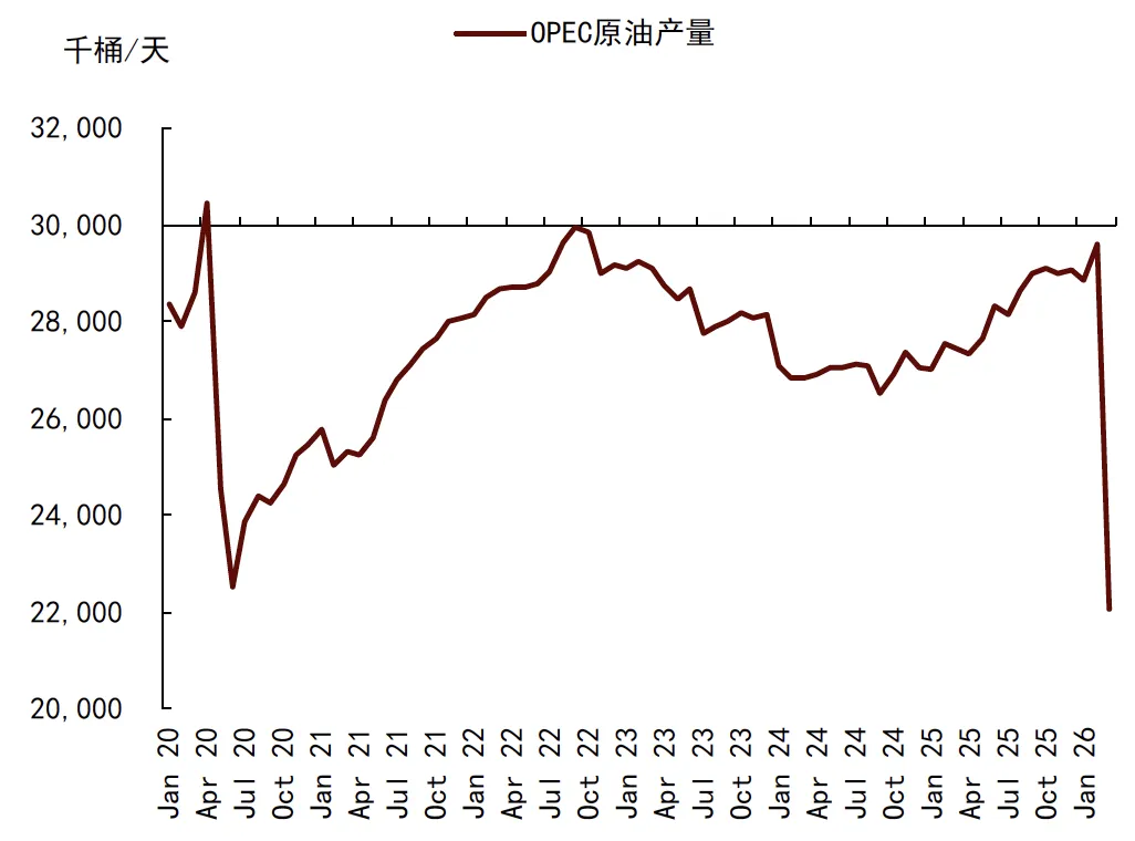 4月8日美伊达成两周停火协议,伊朗表示将在两周内实现霍尔木兹海峡安全通航,石油市场情绪大幅降温,布伦特油价迅速跌破100美元/桶。卫星数据显示,4月首周霍尔木兹海峡石油通行已出现边际恢复迹象,短期看,停火后的贸易恢复或为中东地区累积的约5000万桶原油海上浮仓带来释放机会,并或阶段性缓解亚洲市场的石油库存压力。中期而言,我们一方面提示地缘谈判仍存不确定性,油价波动加大风险仍难言完全解除;另一方面,贸易冲击的外溢风险或已扩散,相较于霍尔木兹海峡复航,海湾国家的原油复产可能需要更多时间。据彭博,3月OPEC原油产量已低于2020年6月低位,环比上月大减约756万桶/天。海湾国家原油产量均有较大程度受损,其中,3月伊拉克减产276万桶/天、环比降幅63%,沙特减产207万桶/天、环比降幅20%,阿联酋减产144万桶/天、环比降幅40%,科威特减产117万桶/天、环比降幅46%。此外,委内瑞拉原油产量和出口均小幅修复,提供缓冲有限。