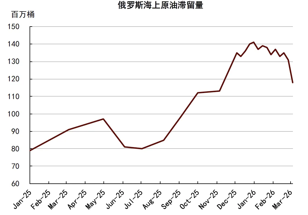 往前看,我们认为目前达成的停火谈判或缓解了布伦特油价短期超涨和波动中枢抬升至风险情形下120美元/桶的压力,但考虑现货短缺和生产受损已经形成,后续能否完全回归基准情形的80美元/桶,可能仍需看到贸易和生产端的更稳健恢复,在此之前油价进一步下跌空间或较有限;并且若地缘谈判进展不及预期,高波动回归风险仍存。此外,地缘冲突对俄罗斯原油出港的短期扰动或也有望为油价提供一些支撑;据彭博,受地缘袭击影响,3月最后一周俄罗斯海运原油出港量损失约175万桶/天,且3月整体出港量较2月小幅下降、原油产量环比基本持平,均尚未受到制裁解除和需求增加的提振。