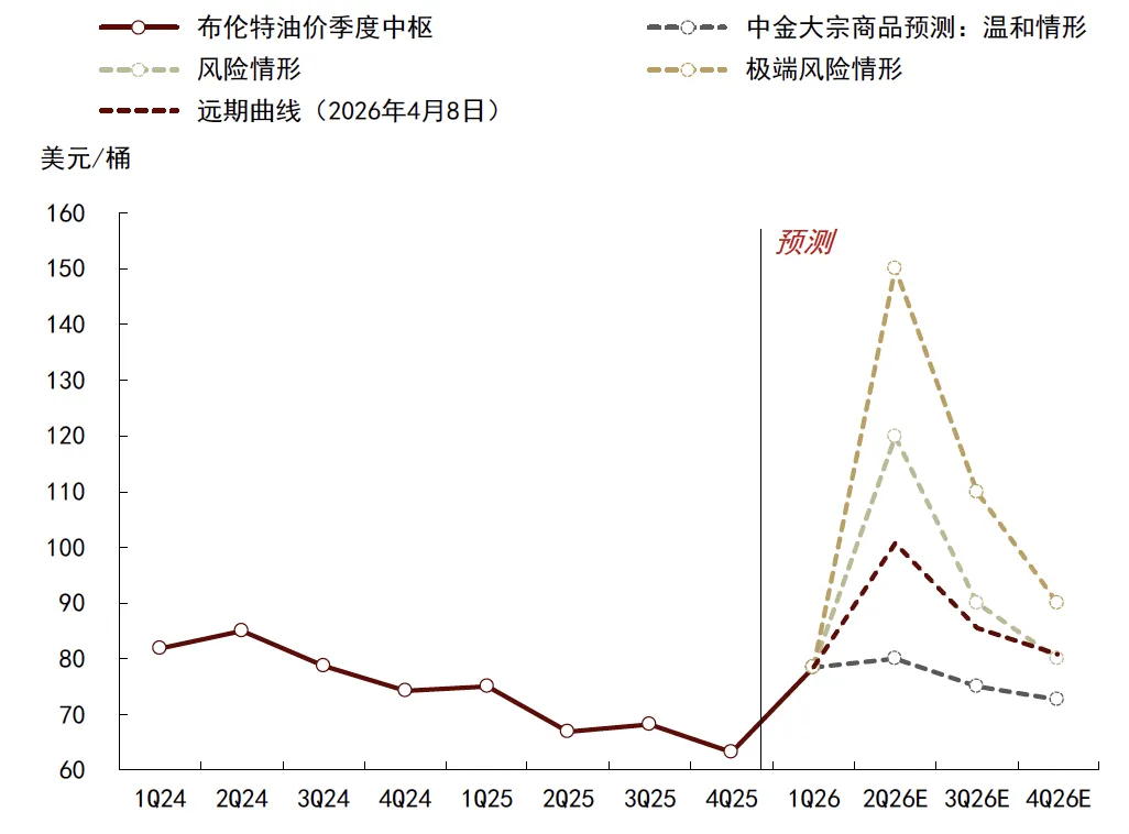 3月以来石油和黄金市场均由美伊地缘局势主导。一方面,石油市场直面霍尔木兹海峡贸易中断冲击,现货短缺格局或已形成。据彭博卫星数据,3月霍尔木兹海峡石油运输基本处于中断状态,即使考虑伊朗保留的一部分原油出口(据彭博监测大概160万桶/天)、沙特和阿联酋通过管道转运实现的原油出口分别约为360万桶/天和70万桶/天,海湾地区石油出口减量或也达到1400-1500万桶/天。考虑需求侧SPR和海上原油浮仓的阶段性释放,美伊冲突对石油市场造成的供应净冲击或在1100-1200万桶/天。目前看,我们在冲突伊始提示的石油现货过剩预期生变风险或已成既定事实;不考虑需求侧变化,当前石油现货平衡或已从过剩约250万桶/天转为短缺800-900万桶/天。随着贸易中断持续且影响外溢,3月下旬以来布伦特油价波动中枢升至100美元/桶,从我们此前预计的温和情形(1-2Q布伦特油价中枢75美元和80美元)向风险情形(1-2Q布伦特油价中枢80美元和120美元)靠拢。