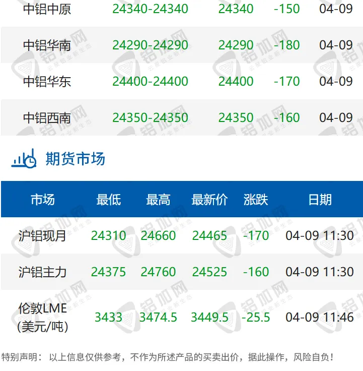 跌!04.09 每日铝锭行情报价