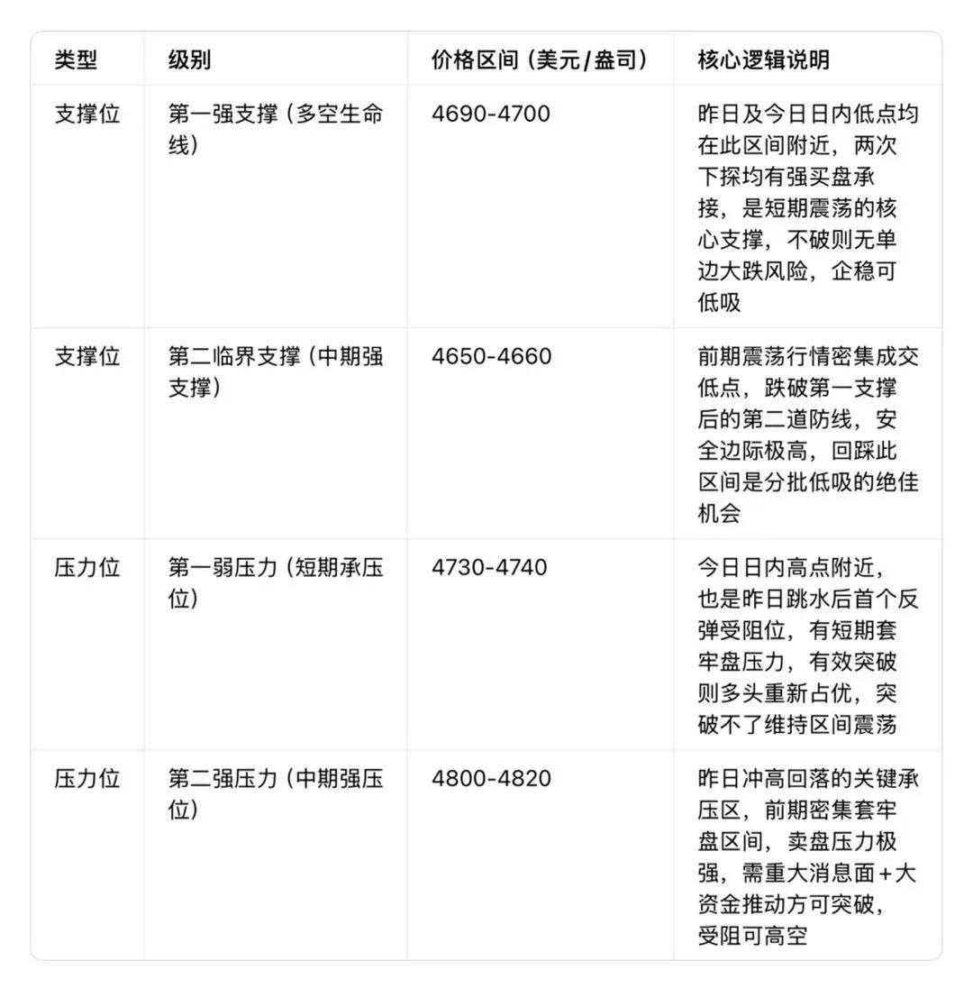 这个位置是当前黄金多空的生命线,重要性不用多说。昨天日内最低砸到4699美元/盎司,今天开盘后最低跌到4698美元/盎司,两次跌到这个区间,都被买盘快速拉起来,说明这里有非常强的承接力量,大量的抄底资金都在这个位置进场。只要这个区间不被大阴线有效跌破,黄金短期就不会出现单边大跌,回踩这个区间企稳,就是低吸的机会。但如果这个位置被有效跌破,且跌破后无法快速收回,下方的下行空间就会打开,下一步就要看第二支撑位。