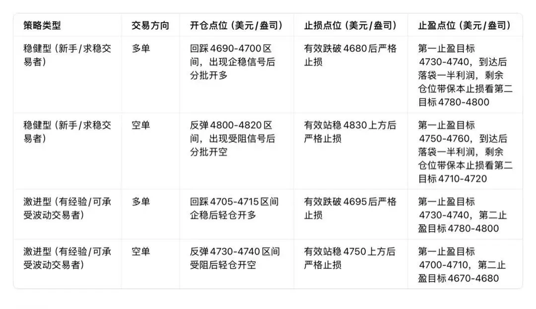 ◦ 止盈点位:第一止盈目标4730-4740美元/盎司区间,到达后可先落袋一半利润,剩余仓位带好保本止损,看第二止盈目标4780-4800美元/盎司区间