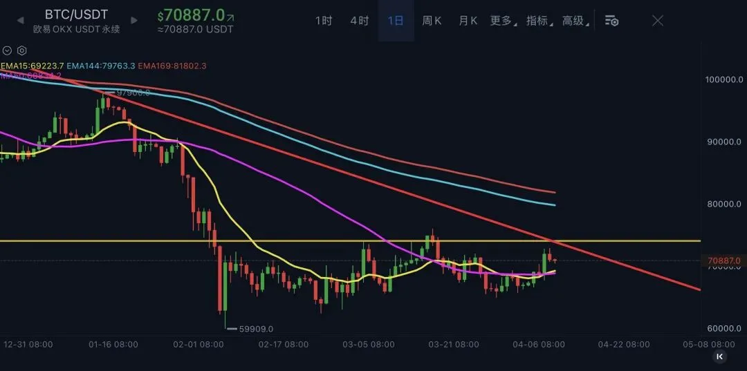 蜡烛图只要不跌破均线就不要重仓做空,可以在72000~75000之间轻仓做空;也可以在69000附近做多,但是多单必须轻仓挂好止损,因为大方向是空头,一旦大跌就是瀑布。这个位置空单被套都没啥事,但是多单被套要套好久的,多单风险更大,空单会稍微好一些。