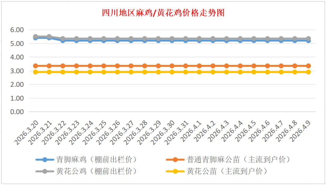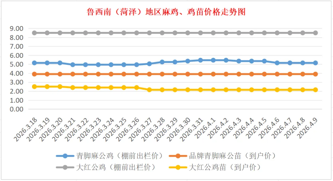 品牌青脚麻公苗(多品种快大型):价格稳定,到户价4.50元/羽,稳。