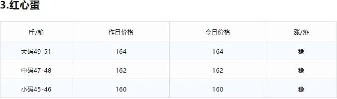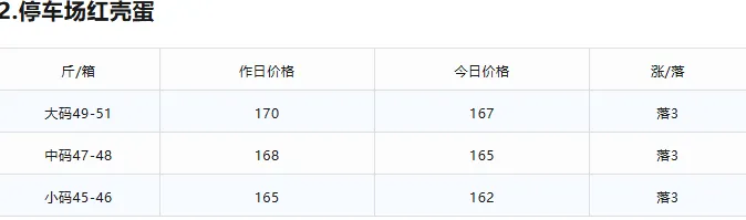 1.今日停车场粉壳蛋各规格价格下落3元,红壳蛋各规格价格下落3元,红心蛋各规格价格保持持稳。