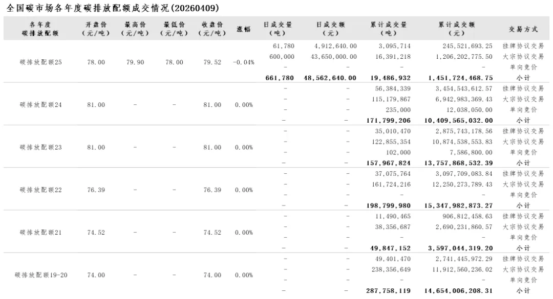 2026年1月1日至4月9日,全国碳市场碳排放配额成交量20,792,693吨,成交额1,555,573,202.35元。