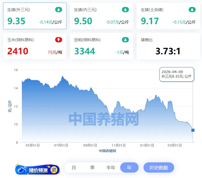 2026年4月9日全国外三元均价9.35元/公斤,今日猪价较昨日报价下跌了0.14元/公斤。