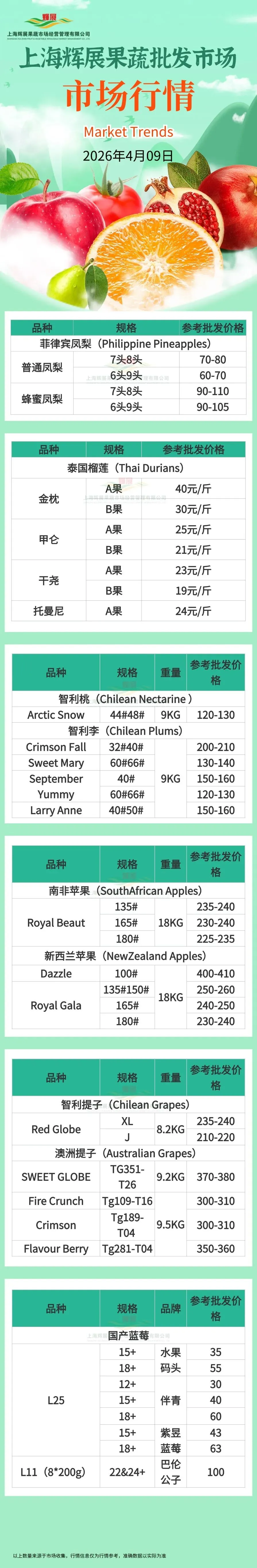 >4月09日上海辉展果蔬批发市场行情 |国产蓝莓、智利李、智利提子、南非苹果、菲律宾凤梨等