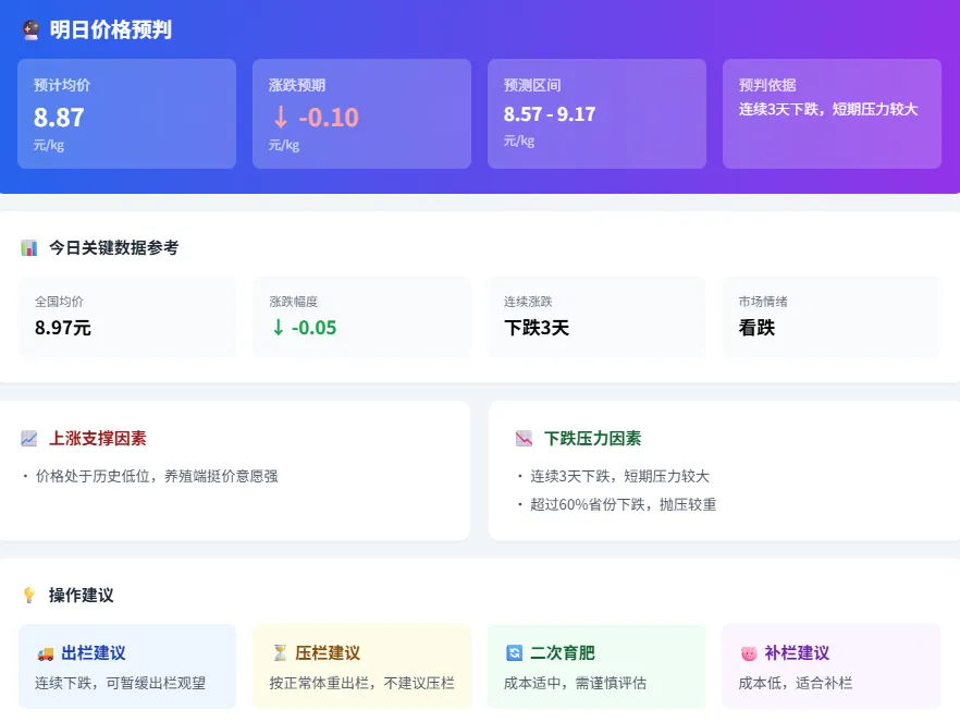 🔗 产销价差分析:猪肉(17.00) - 生猪(8.97) = 8.03元(价差率89.5%)。价差率较高,屠宰利润丰厚,但终端消费承压,需警惕价格回调风险。