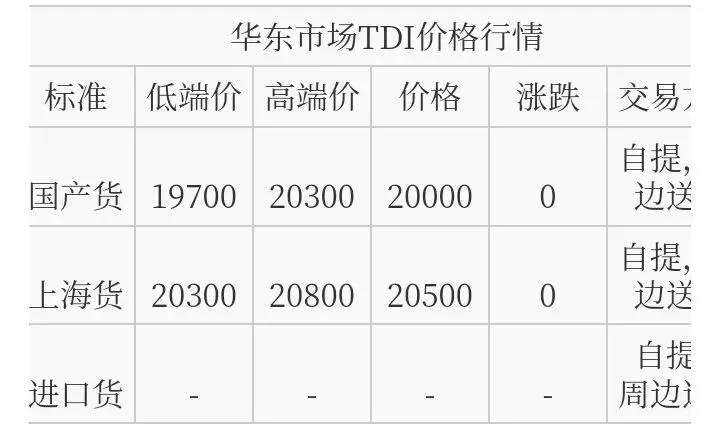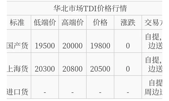 华北TDI国产货报盘价格在19500-20000元/吨,上海货报盘价格在20300-20800元/吨。
