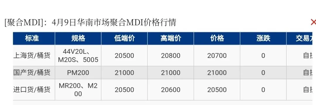 【市场动态】华东区域聚合MDI上海货报盘20500-20800元/吨,国产货(PM200)报盘20800-21000元/吨,进口货报盘20500-20600元/吨。