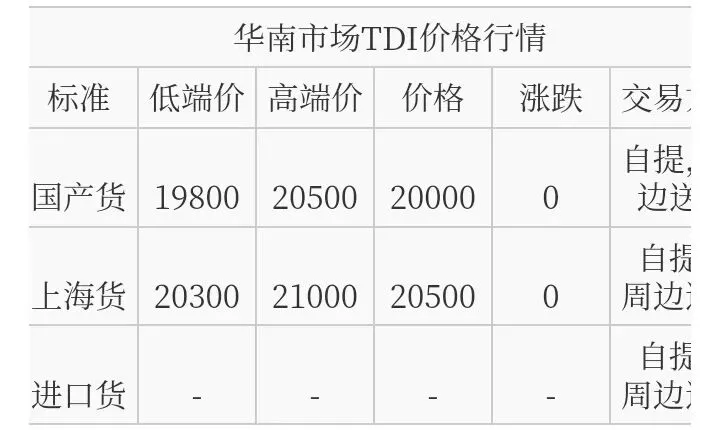 华南TDI国产货报盘价格在19800-20500元/吨,上海货报盘价格在20300-21000元/吨,报盘宽泛。