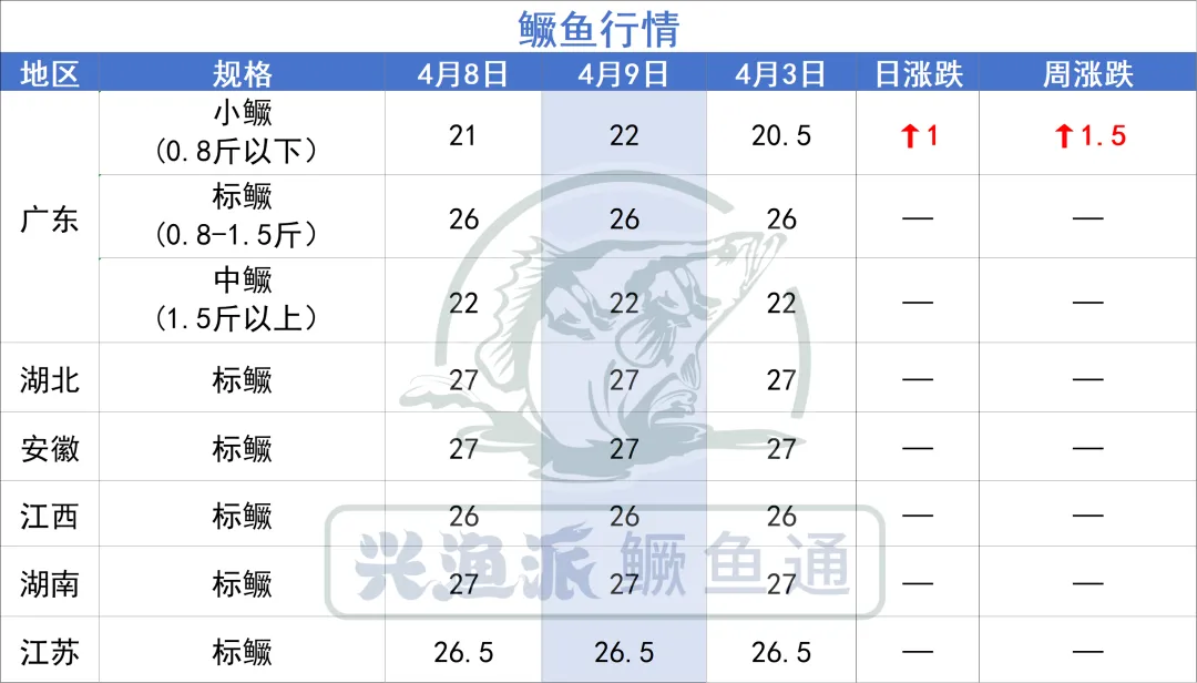 4月9日,广东小鳜涨1元/斤,