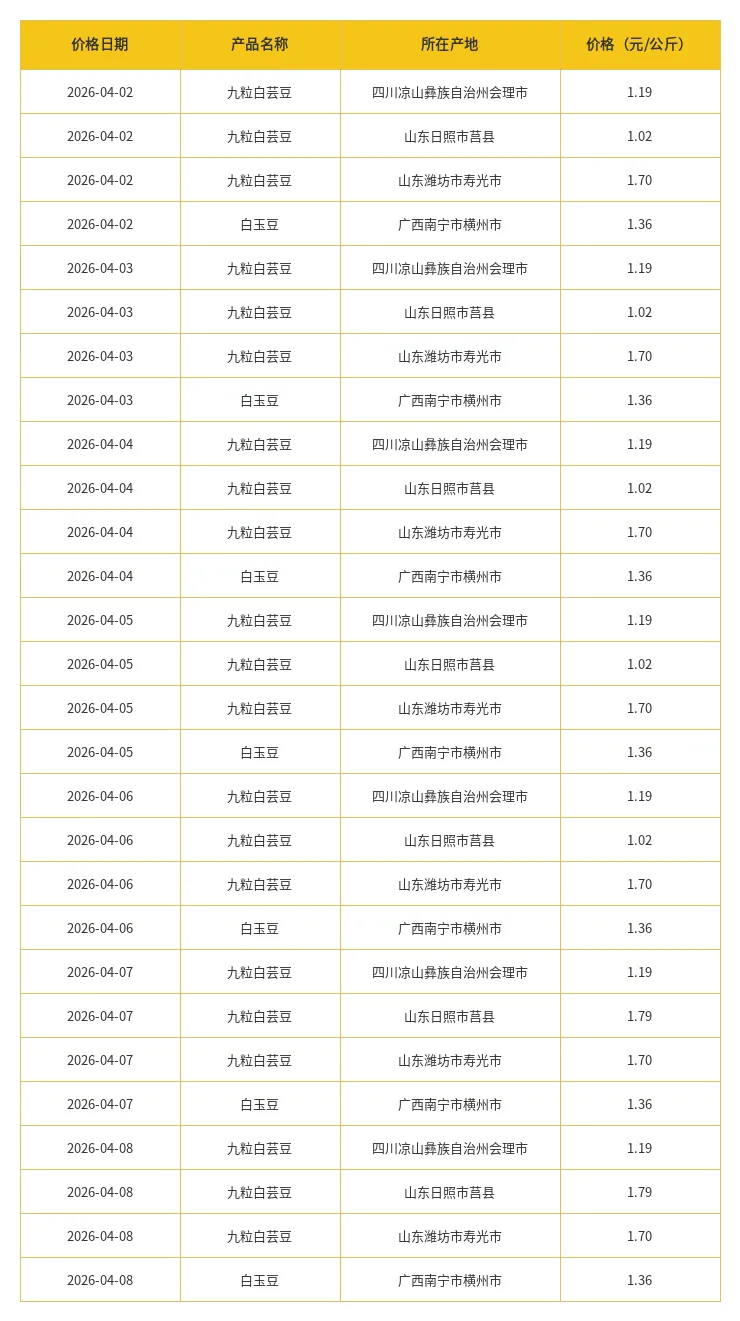 本周(4月2日--4月8日)豆科产品主要产地价格如下表: