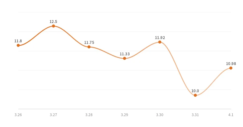 据农业农村部"全国农产品批发市场价格信息系统"监测,上周(3月26日--4月1日)芸豆(鲜食)全国市场价格走势如下图: