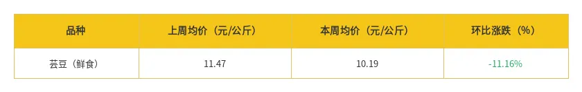 本周芸豆(鲜食)全国市场价格略有所下跌,下跌幅度11.16%