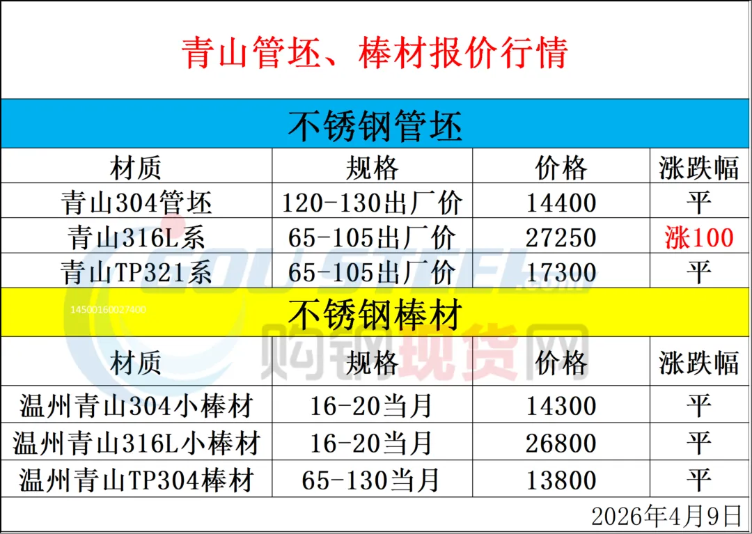 当前位置:首页>行情>4月9日青山管坯、棒材报价行情