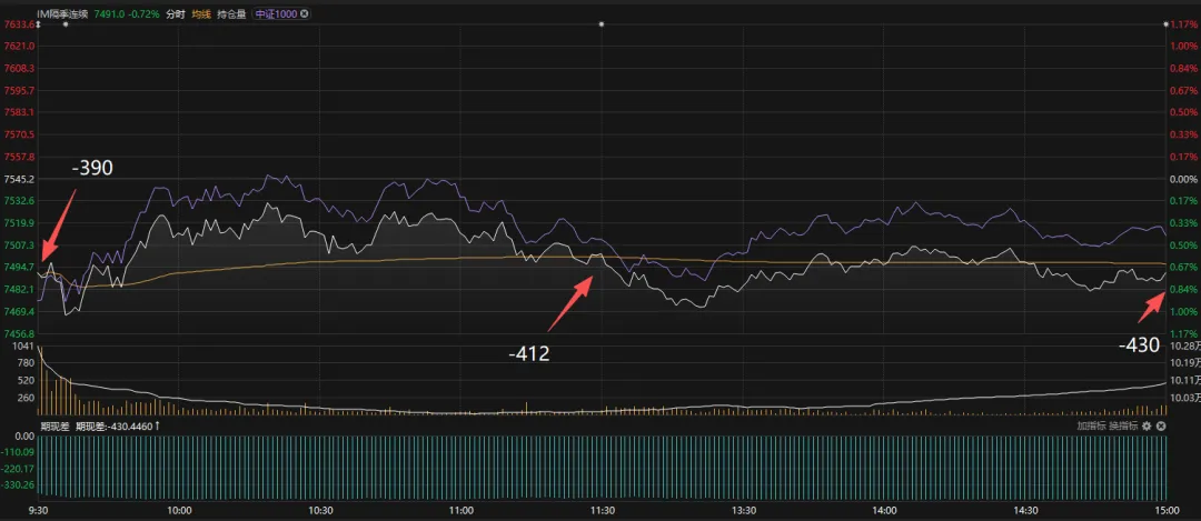 个股涨跌比1:4。通信标的连板。期指贴水收盘在-430(较上一交易日-40点,如下图),因为不确定性,主力又在做空应对了。