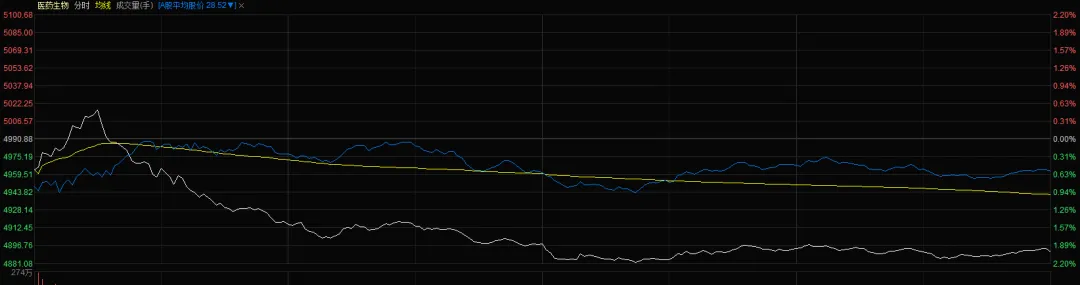 从板块异动和涨幅看(如上图),封板率还不错,但涨停数和连板情况并没有特别好,说明游资并不兴奋。消费大面积回调,感觉主力基本不怎么关注内需和可选消费,偏重的仍是通胀和科技。往年春节前后,相关消费多少活跃一下,但今年零食、家电、商贸零售、宠物等相关板块走的都偏弱。近期比较强的药(刚需)今天也出现了明显回调。从今天的分时看(冲高快速回落,如下图),抛压加大,短线可能还要进一步修复,等这波修复完,医药生物应该还可以留意,其他消费建议等右侧信号出现,不急下手。