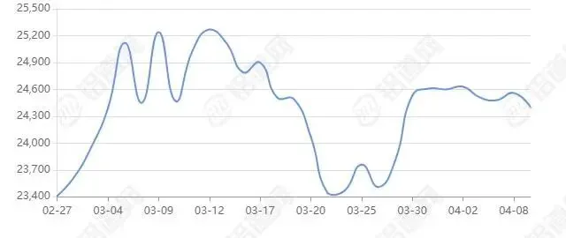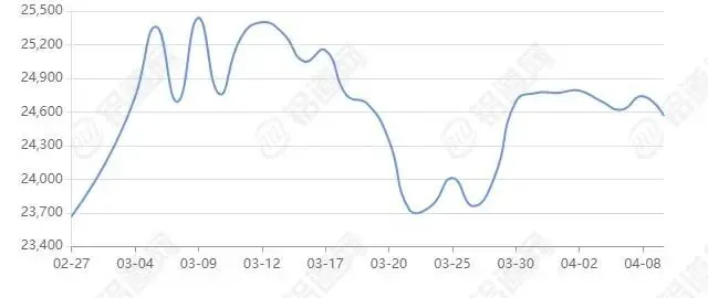 2026年04月09日上海期货行情价24645涨跌+10,最低24500,最高24660,前三日均价24573,前五日均价24708。